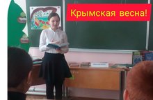 "Крымская весна" 20.03.2021 С 18 по 20 марта в школе проводились ряд мероприятий, посвященные годовщине воссоединения Крыма и Севастополя с Россией. Учитель истории И.Т.Гафаров с учащимися 5-9 классов провел урок познания "История Крымской весны". Учителя начальных классов провели экскурсию в историю "Крым и Россия -единая судьба", библиотекарь школы Ахметова Л.Х. провела видеопрочтение стихов "В единстве наша сила".