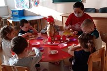 Каждый вид изобразительной деятельности позволяет развивать в детях умственную активность, творчество, художественный вкус и многие другие качества, без которых невозможно формирование первоначальных основ социально активной личности. На занятиях лепкой вышеперечисленные качества развиваются особенно. Так как любой предмет имеет объём, он воспринимается ребёнком со всех сторон. Лепка, как деятельность в большей мере, чем рисование или аппликация, подводит детей к умению ориентироваться в пространстве. Воспитатели нашего детского сада чаще всего для лепки используют пластилин, но в последнее время появился еще один очень популярный материал - тесто. Солёное тесто - чудесный материал для работы. Лепить любят абсолютно все дети. Дети второй младшей группы вместе с воспитателем слепили из слоёного теста татарское национальное блюдо эчпочмак. Детки с огромным удовольствием работали с тестом.