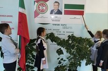 Классный руководитель Айнетуллова З. А. рассказала об истории создания флага, главного символа нашей республики, о значении цветов Татарстана.