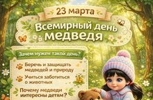 23 марта отмечается Всемирный день медведя — праздник, посвящённый этим удивительным и сильным животным. Этот день появился благодаря экологам и защитникам природы, чтобы привлечь внимание людей к сохранению медведей и их среды обитания. Многие виды медведей сегодня нуждаются в защите из-за изменения климата и деятельности человека.
