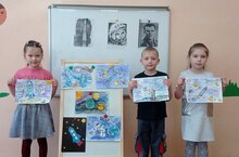 В нашем садике ребята вместе с воспитателем организовали тематическую выставку своих рисунков на тему «Мы рисуем космос», посвященную Дню космонавтики.
