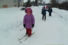 Дети в детском саду во время прогулки охотно катаются на лыжах и на санках.