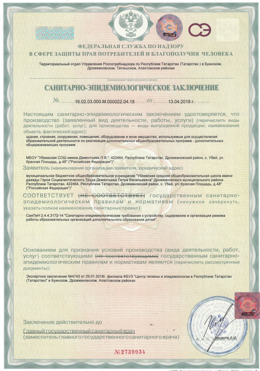 СЭЗ здания, строения, сооружения, помещения, оборудование и иное имущество, используемые для осуществления образовательной деятельности по реализации дополнительных общеобразовательных программ - дополнительных общеразвивающих программ №16.02.03.000.М.000022.04.18 от 13.04.2018 г.
