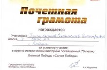 Пшеничников Стас принимал участие в военно-исторической викторине, посвященной 70-летию Великой Победы "Салют Победы". Организатором викторины является депутатская группа "Инициатива Елабуги" и редакция газеты "Новая Кама". Задания викторины были поделены на две категории: вопросная часть и творческое эссе. Вопросная часть состояла из 70-ти вопросов, касающихся тематики Победы Советского народа в годы ВОВ, творческое эссе было на тему "Моя семья в Великая Отечественная война". Награждение победителей состоялось в кинотеарте "Бруклин", где ребята получили почетные грамоты и памятные призы. Поздравляем победителей!