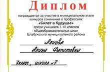 Алиева Алина (рук. Кочеткова Л.В.) и Кривицкий Руслан (рук. Чадаева Т.В.) принимали участие в муниципальном этапе конкурса сочинений и рисунков о профессиях "Билет в будущее", получили дипломы участников конкурса.