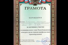 Команда школы была награждена грамотой за активное участие в муниципальном этапе Республиканского конкурса среди отрядов профилактики.