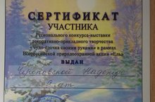 Наконец-то мы получили долгожданный сертификат за участие в конкурсе декоративно-прикладного творчества "Чудо-елочка своими руками", который проходил в декабре 2014 года в рамках Всероссийской природоохранной акции "Ель". Награду получила Череповская Надя (6 лет, подготовительная группа).
