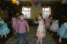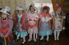Одним из праздничных конкурсов для мам - "сшить" платье или костюм ребенку из подручного материала. Получилось отлично.