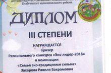 Поздравляем Захарову Р.Б., занявщую 3 место в региональном конкурсе"Эко лидер-2018" в номинации "Семья эко-традициями сильна".Желаем дальнейших творческих успехов.
