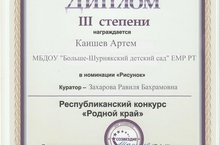 Поздравляем Каишева Артема,занявшевго третье место в республиканском конкурсе риунков "Родной край".Так держать!