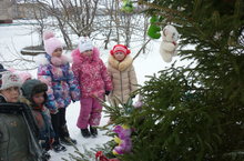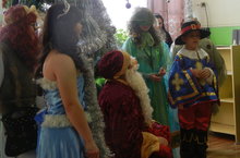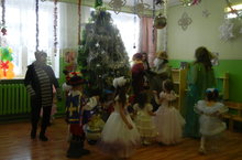 Дети пришли на новогодний утренник нарядные, весёлые в предвкушении праздника. И их надежды оправдались. Воспитатель, сотрудники детского сада участвовавшие, в новогоднем представлении проявили себя хорошими артистами, показав всё своё творческое мастерство, артистизм, задор и организаторские способности. Им пришлось перевоплотиться в разных героев: Кикимору,Лешего, Бабу Ягу, Снегурочку, Деда Мороза и кота Баюна. С самого начала представления сказочные герои увлекли детей в волшебный мир сказки.