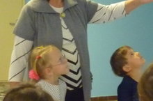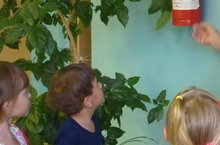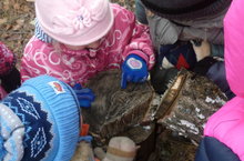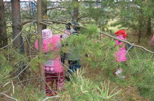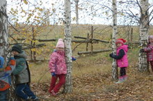 Детишки рассматривают спил березы. На спиле видны годичные кольца. Сколько колец, столько лет дереву.Широкие кольца--это годы, когда было много тепла и дождей и дерево росло особенно быстро. Узкие кольца--память о засушливых, холодных годах, когда рост дерева тормозится. Воспитанники считают годичные кольца и определяют возраст березы.