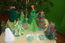 Родители и дети сделали елочки из разного бросового материала: бумаги, картона, полиэтиленовых мешков и соленого теста.