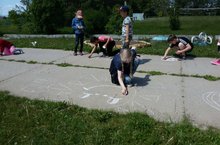 Сегодня дети выступали в поддержку идей мира и пропаганду вечных ценностей дружбы и солидарности народов. Дети говорили о том, что они любят свою Родину и хотят внести свой вклад в общую борьбу за мир. Особенно детям полюбился конкурс рисунков на асфальте. На фото дети рисуют мир во всё мире.