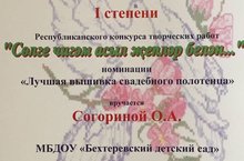 Педагоги нашего детского сада принимают активное участие в конкурсах различных уровней. Диплом первой степени в республиканском конкурсе творческих работ "Сөлге чигәм асыл җепләр белән..." в номинаөии "Лучшая вышивка свадебного полотенца"