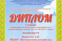 Диплом I степени в номинации "Лучшая методическая разработка" (лучший конспект занятия) по теме "В гостях у сказки"