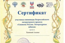 Активная участница различных олимпиад и конкурсов Хазиева Азалия приняла участие в олимпиаде Всероссийского литературного проекта «Символы России. Литературные проекты»