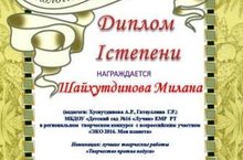 6 декабря в Менделеевском районе прошел региональный экологический форум-фестиваль «У природы есть друзья – это ты, и мы, и я!». В этом фестивале активное участие приняли и воспитанники нашего детского сада. А воспитанница подготовительной группы Шайхутдинова Милана удостоилась высокой награды-Диплома I степени в конкурсе лучших творческих работ "Творчество против недуга". Поздравляем нашу победительницу!