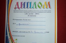 Поздравляем воспитателя Зульфию Рафисовну, ее дочь Язгуль с Дипломом II cтепени муниципального конкурса семейных вокальных дуэтов дошкольных образовательных учреждений Елабужского муниципального района “Две звезды-2016” в возрастной категории с 3 до 5 лет номинации "Туган тел". Желаем здоровья, творческих успехов и удачи!!!
