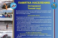В весенний период лёд начинает таять и становится непрочным. Скреплённый ночным холодом, он ещё способен выдерживать небольшую нагрузку, но днём быстро нагреваясь. От просачивающейся талой воды, «тело» льда становится пористым и очень слабым, хотя сохраняет достаточную толщину. Весенний ледяной покров на реках нельзя использовать для катания и переходов, – такой лёд очень тонкий, непрочный и не выдерживает тяжести человека. Во льду образуются воздушные поры, которые при движении трудно заметить. Чтобы избежать трагедии в нашем детском саду в каждой группе в родительских уголках есть памятки для родителей «Осторожно! Тонкий лед». Также по данной теме с родителями проведены беседы и консультации.