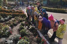 Несмотря на то, что на дворе уже осень, погода не перестаёт радовать тёплыми деньками. Воспитатели с детьми пользуются каждым днём, чтобы полюбоваться живой природой. Сегодня дети 7 группы остановились около цветника. Любовались цветами, которые высадили весной: бархатцы, петуньи, циннии. Закрепили наглядно знания об особенностях строения растений (стебель, лист, бутон, цветок, лепесток). Ещё ребята с интересом наблюдали за тем, как насекомые ещё трудятся над цветами, продолжают собирать нектар.