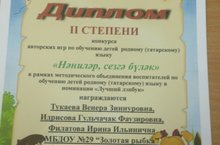 Буген 17 балалар бакчасында методик берләшмә үтте. План буенча «Уеннар кулланып мәктәпкәчә яшьтәге балаларны ике теллелеккә өйрәтүнең сыйфатын үстерү” дигән тема куелган иде. Берләшмәдә “Нәниләр сезгә бүләк” дигән бәйгенеӊ нәтижәләредә билгеле булды. Бу бәйгедә безнеӊ балалар бакчасыннан “Минем яраткан уеным “ номинациясендә Тукаева В.З., Идрисова Г.Ф., Филатова И.И. 2 дәрәжә дипломга лаек булдылар.