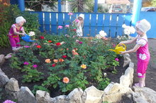 В детском саду растут прекрасные розы, за которыми с радостью ухаживают дети, помогая взрослым создавать уют и красоту.