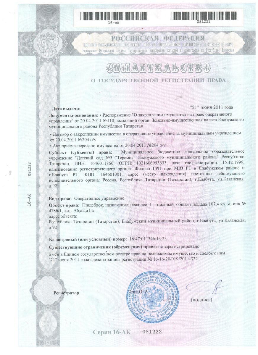 Свидетельство о государственной регистрации права (детский сад)