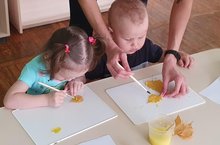Листья желтые летят... Сегодня малыши 5 группы знакомились с березовыми листочками. На занятии по рисованию ребята с помощью воспитателя наносили краску на листик березы, а затем прикладывали и прижимали его на листе бумаги. Когда дети видели отпечаток своего листика, они приходили в восторг! Вот так интересно и познавательно проходит знакомство с осенней порой!