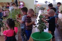 Воспитанники средней группы под руководством воспитателя поливают и протирают растения. Это даёт детям понятия о том, что растениям необходимы вода и свет, что за ними нужно ухаживать, поливать, протирать листья, опрыскивать. Учить выполнять эти действия.