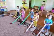 4 нче кече яшьтәге төркем балалары хәрәкәтле һәм аз хәрәкәтчән уеннар уйнарга бик яраталар. Безнең әти-әнилар үз куллары белән безгә стандарт булмаган физкультура җиһазлары ясадылар. Бу уен балаларда вак моториканы, хәрәкәтләрне координацияләү, җитезлекне үстерә һәм балаларны сигнал буенча ориентлашырга, парларда үзара хезмәттәшлек итә белергә өйрәтә. Уенчының бурычы-бөтен тасманы мөмкин кадәр тизрәк җыю. Бу моториканы үстереп кенә калмый, кәефне дә күтәрә! Уенны балалар бик ошаттылар һәм теләп уйныйлар.