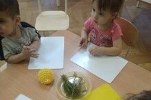 В младшей группе № 3 в гости пришел Ежик. Чтобы ежику не было грустно, дети на уроке лепили ему друзей из пластилина. Вместо игл использовали еловую хвою.
