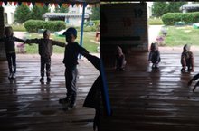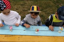 Җәй көне генә, туңудан һәм пычранудан курыкмыйча, саф һавада, рәхәтләнеп, ком, су, яфраклар белән уйнарга һәм төрле тәҗрибәләр үткәрергә була. Бүген без дә 2 нче төркем балалары белән урамда су белән тәҗрибә үткәрдек. Бу тәҗрибәнең максаты суның үтә күренмәлеген ачыклау иде. Балалар су салынган стаканга төрле төстәге вак предметларны төшереп карадылар. Соңыннан су төссез, үтә күренмәле һәм аның аша предметлар күренә дип нәтиҗә ясадылар.