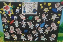Менә татарчага тәрҗемәсе:12 апрель – Космонавтика көне алдыннан, тәрбияче һәм әзерлек төркеме тәрбияләнүчеләре "Космосны яулаучылар" дип исемләнгән стенгазета ясадылар, анда балалар серле һәм сихри космос белән якыннан таныша алдылар. Балалар стенгазета ясауда зур теләк белән катнаштылар. Стенгазета ясау барышында балалар Кояш системасы, беренче космонавт Юрий Гагарин, космик аппаратлар, Ай һәм Кояш, кометалар һәм метеоритлар турында күп нәрсә белделәр. Стенгазетаны ата-аналар өчен мәгълүмат почмагына урнаштырдылар, һәм балалар алган белемнәрен әниләре һәм әтиләре белән зур шатлык белән уртаклаштылар.
