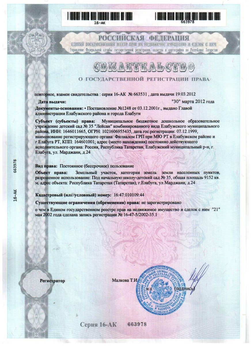 Муниципальное бюджетное дошкольное образовательное учреждение детский сад №35 «Лейсан» комбинированного вида Елабужского муниципального района/Алабуга муниципаль районы 35 нче "Ләйсән" катнаш төрдәге балалар бакчасы муниципаль бюджет мәктәпкәчә белем бирү учреждениесе