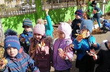 На прогулке ребята дошкольники устроили соревнование: «Кто забьет мяч, быстрее до флажка». Наблюдали за красотой листопада. Набрали листьев для поделок. Ребята много играли, общались со сверстниками. Прогулка обеспечила хороший заряд бодрости на целый день у дошкольников.