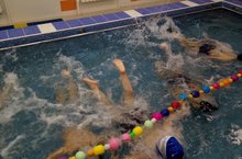 На занятиях по плаванию воспитанники учатся плавать способом "Кроль", закрепляют отталкивание от бортика и скользят на груди и спине с выдохом в воду с открытыми глазами, выполняя упражнение "Стрела".