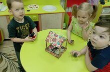 Проведены были занятия порисованию, лепке и по аппликации на тему "Синички-наши друзья". Дети с удовольствием наклеивали птичек на кормушку. Привлечены были и родители со своими детьми в изготовлении кормушек и дидактических игр.