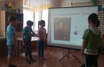 Атна дәвамында тәрбияче Гильманова Р.М. балаларны әкиятләр, шигырьләр белән таныштырды, әсәрләргә иллюстрацияләр күрсәтте. Дәрес өчен тәрбияче презентация, күрсәтмә материал кулланды: аның гаиләсе һәм нянясының портретлары, иллюстрацияләр, А.С. Пушкин булган шәһәрләрне һәм аның һәйкәлләре белән таныштырды. Балалар бакчасында А.С. Пушкин иҗатына кечкенәдән үк мәхәббәт тәрбияләнә.
