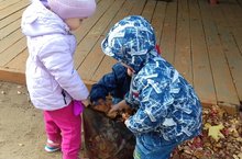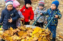 Көз җитү белән агач яфраклары саргая һәм коела башлый. Уйнау мәйданчыгы көн саен коелган яфрак белән тула. Ә без кечкенә булсак та , яфраклардан җитезрәк, аларны җыйнап, мәйданчыкны чистартып торабыз. Тәрбияче апаларга һәрвакыт булышабыз. Менә шулай: кечкенә дә, төш кенә.