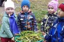Бүген 9 төркемдә тәрбияләнүче балалар тәрбиячеләре Наталья Николай кызы Козырева белән үз мәйданчыкларын чистартырга булдылар. Балалар рәхәтләнеп кипкән яфрак һәм чәчәкләрне бер өемгә җыярга һәм ташырга булыштылар. Алар бу эшләрне эшләгәндә үзләрен җаваплы, зур ярдәмчеләр итеп хис иттеләр. Һәрберсе чын күңелдән көченнән килгәнчә булышты.