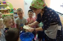 После того, как мы прочитали сказку “Колобок”, у нас появилось желание самим лепить колобка из настоящего теста. Наша воспитательница Рамиля Равиловна на следующий день уже повела в страну «тесто». Мы вместе месили тесто, а потом лепили много колобков. Тесто на много раз мягче и интереснее, чем пластилины, вот это нам очень понравилось.