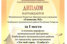 Сегодня МБОУ "Гимназия №2" была награждена дипломом I степени за участие в осеннем марафоне муниципальной программы Елабужского муниципального района по городскому ориентированию "Это мой город - Елабуга!" Поздравляем!
