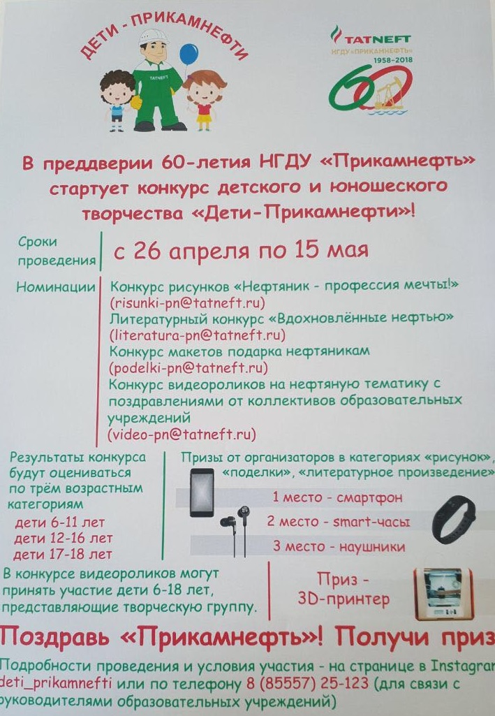 Шәhәребезнең нефть-газ табу “Прикамнефть”идарәсе үзенең 60 еллыгы уңаеннан кече hәм уртача яшьтәге укучы балалар өчен иҗади конкурс игълан итте. Ул “Прикамнефть балалары” дип атала. Конкурс 26 нчы апрельдән 15 нче майга кадәр барачак.