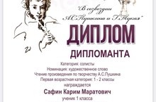 1 нче сыйныф укучысы Сафин Кәрим «А.С. Пушкин һәм Г.Тукай йолдызлыгында» республика иҗат бәйгесендә дипломант исеменә лаек булды. Шулай дщвам ит, Кәрим! -