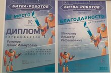По итогам соревнований Усманов Данис занял 3 место в номинации Сумо Автономных роботов. Младшая категория (10-13 лет).11.11.2022 елда Яр Чаллы шәһәренең "Кванториум" балалар технопаркы базасында "роботлар сугышы"робототехникасы буенча ярышлар узды.