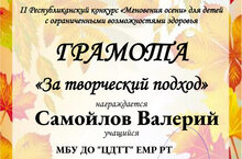 Грамота "За творческий подход" во II Республиканском конкурсе "Мгновения осени" для детей с ограниченными возможностями здоровья / Сәламәтлек мөмкинлекләре чикле балалар өчен" көз мизгелләре "II республика конкурсында" Иҗат өчен " грамотасы 03.11.2022