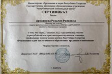 27 октября 2022 года педагог дополнительного образования Арсланова Розалия Раисовна (объединение «Технология художественного творчества») приняла участие в республиканском практико-ориентированном семинаре профильных экологических центров Республики Татарстан «Реализация задач экологического образования: традиции и инновации» на базе детского эколого-биологического центра города Елабуги.