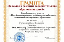 18 ноября 2022 года методист ЦДТТ Файзуллина А.Ф. приняла участие в Республиканском конкурсе «Портфолио руководящих и методических работников организаций дополнительного образования». По итогам конкурса она отмечена грамотой «За вклад в развитие дополнительного образования детей».