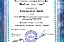 26 декабря 2020 года обучающаяся в объединении «ТХТ», Габидуллина Луиза приняла участие в Всероссийском конкурсе фотографии «В объективе - Зима», педагог ДО Арсланова Р.Р. получила благодарственное письмо.
